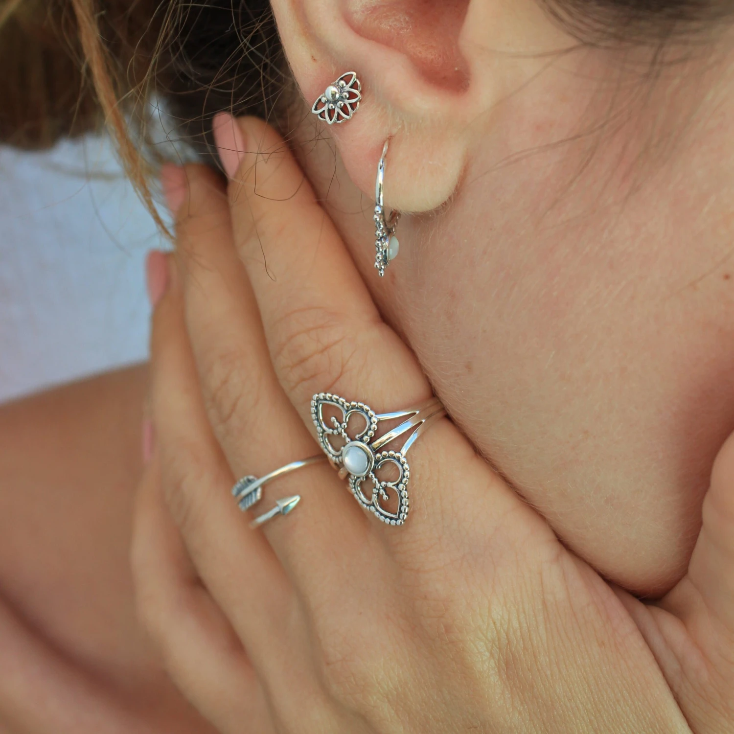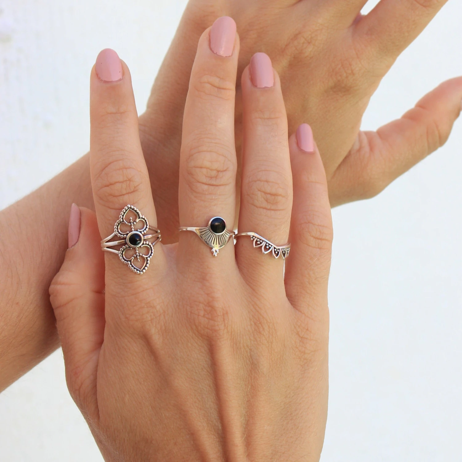 Un anillo con flores labradas y una pieza central a elegir en tres minerales, ónix, nácar o turquesa