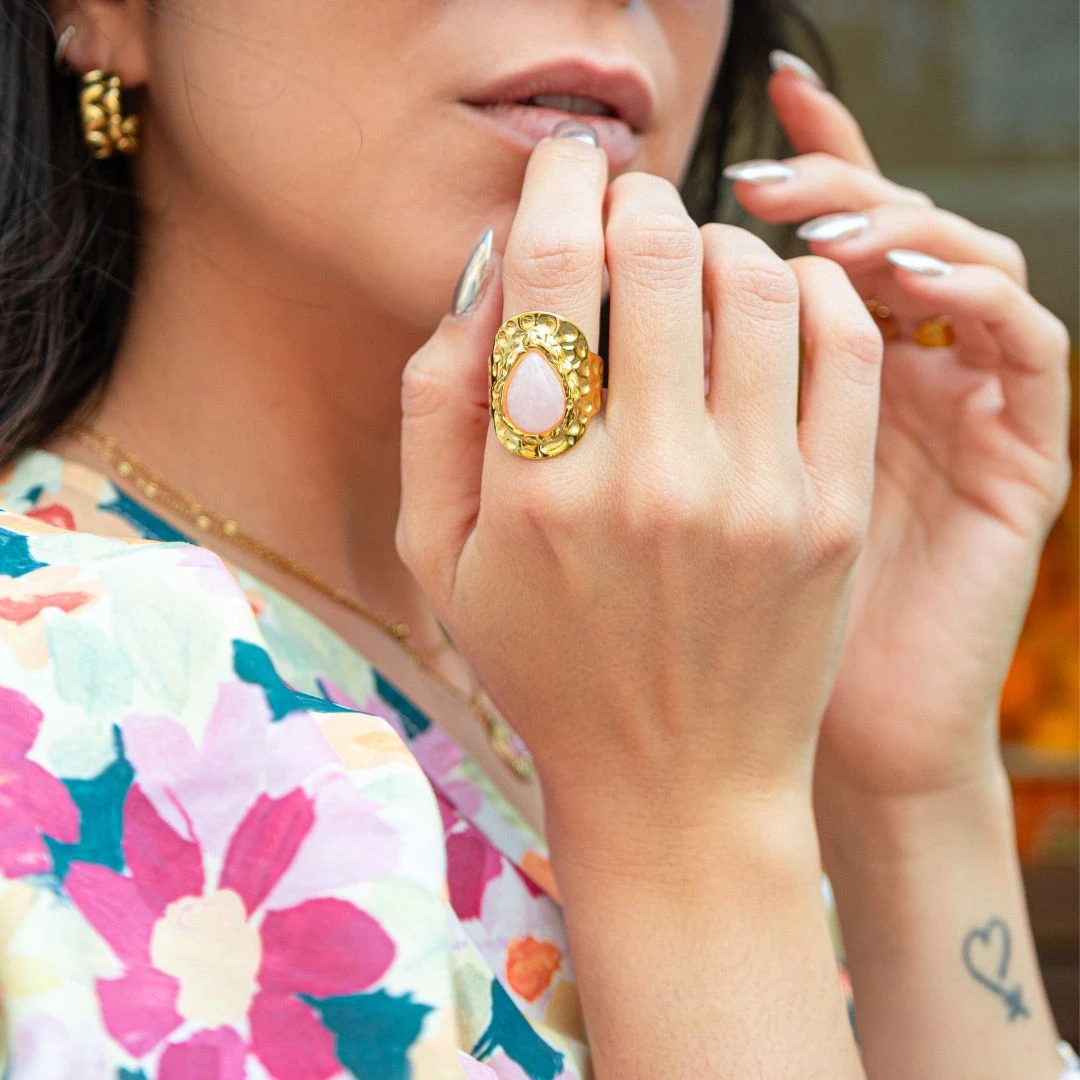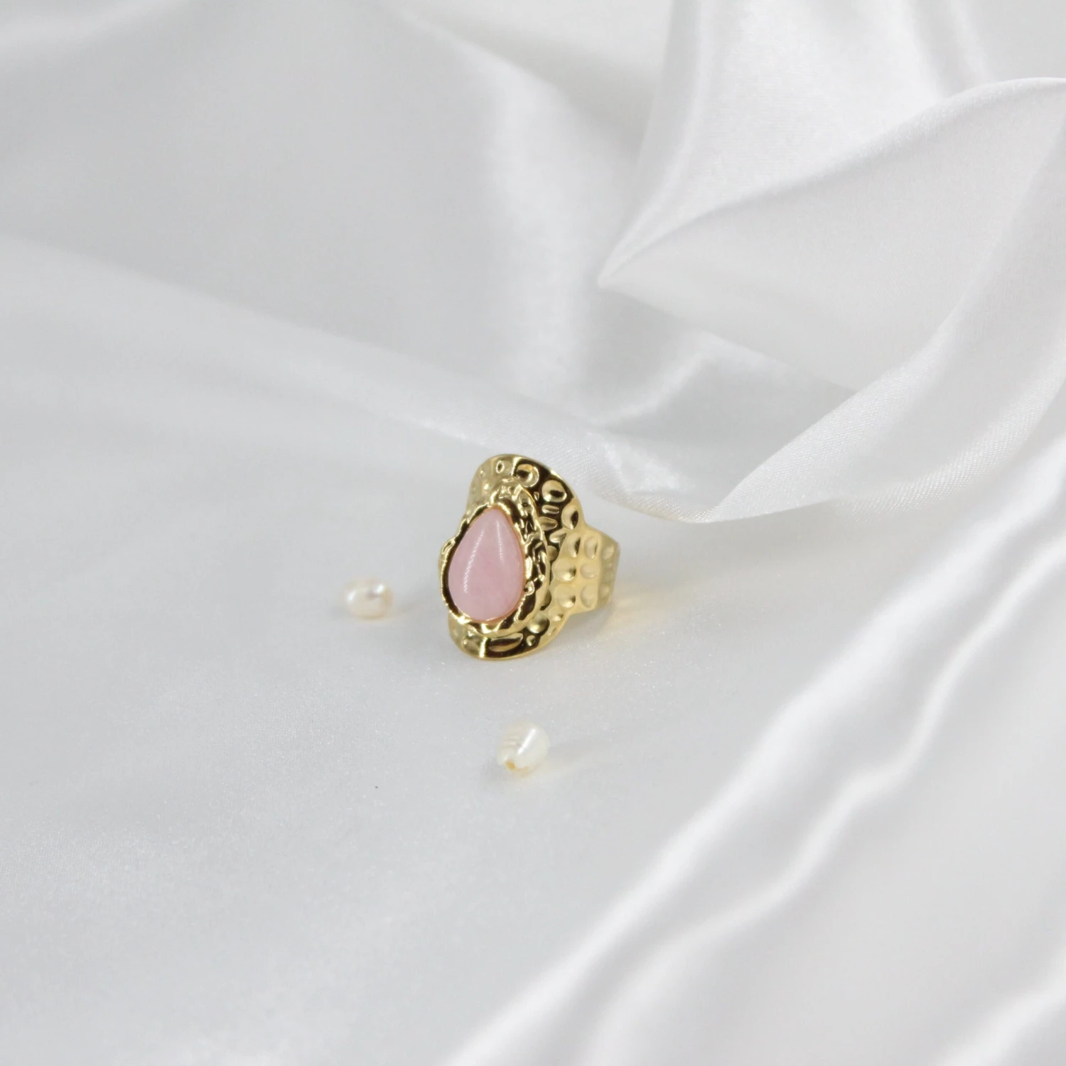 Gran Anillo poderoso con piedra mineral natural en forma de gota de Cuarzo Rosa o Calcedonia y troquelado con textura rugosa