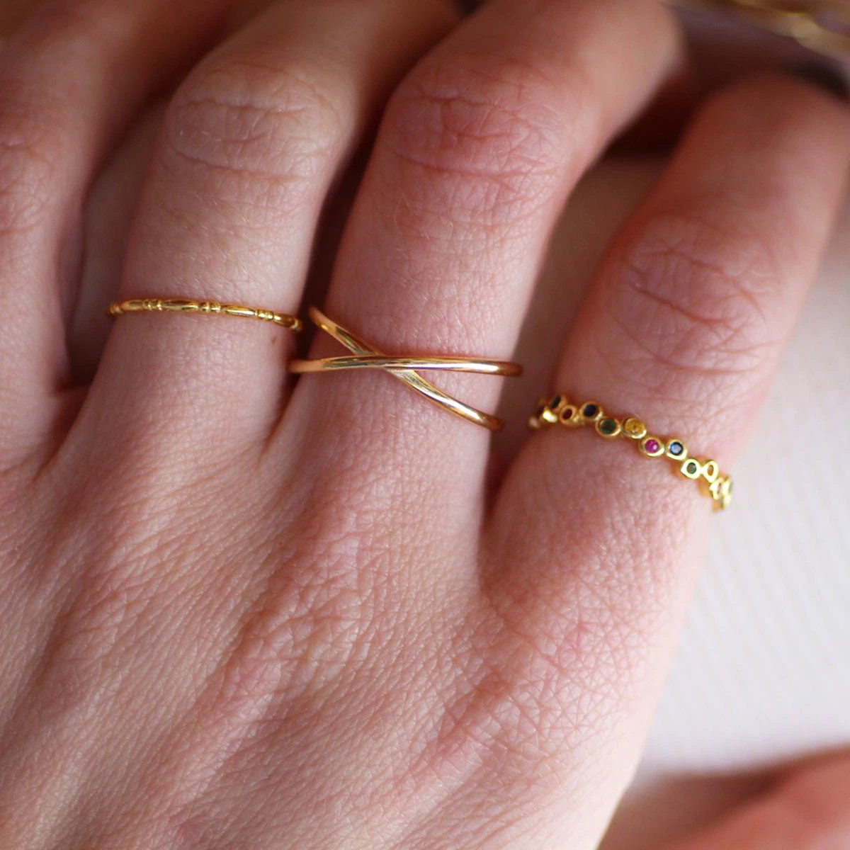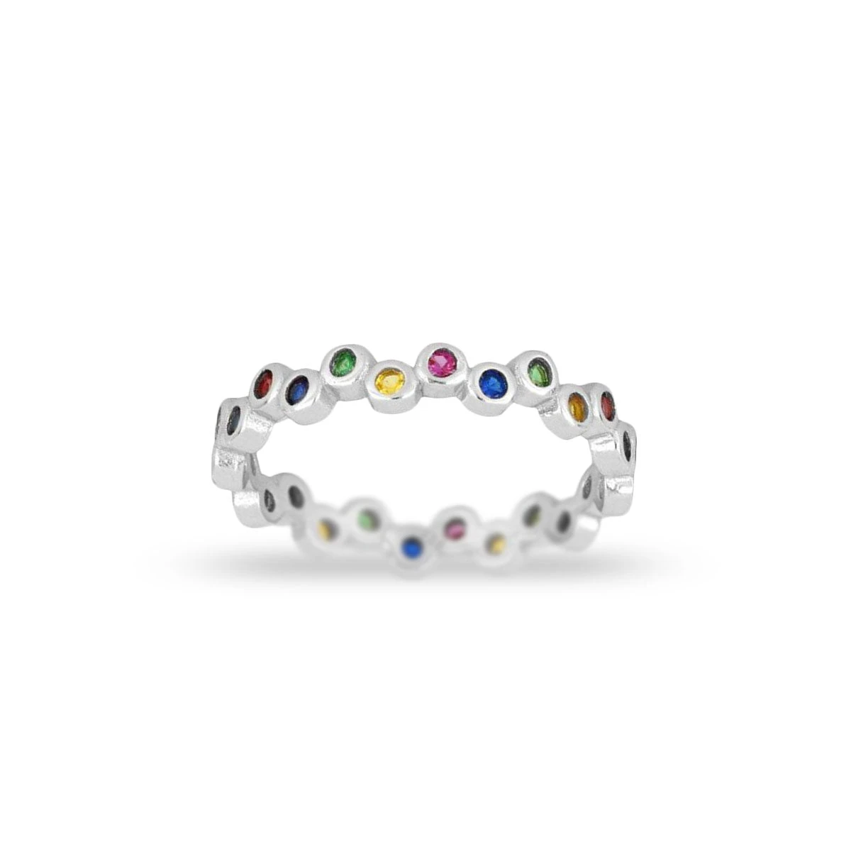 Anillo de plata compuesto por círculos alrededor de la banda con topacios de colores engastados.