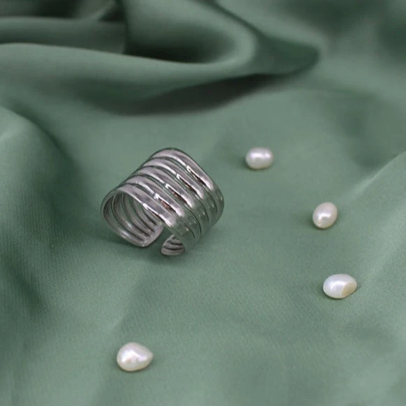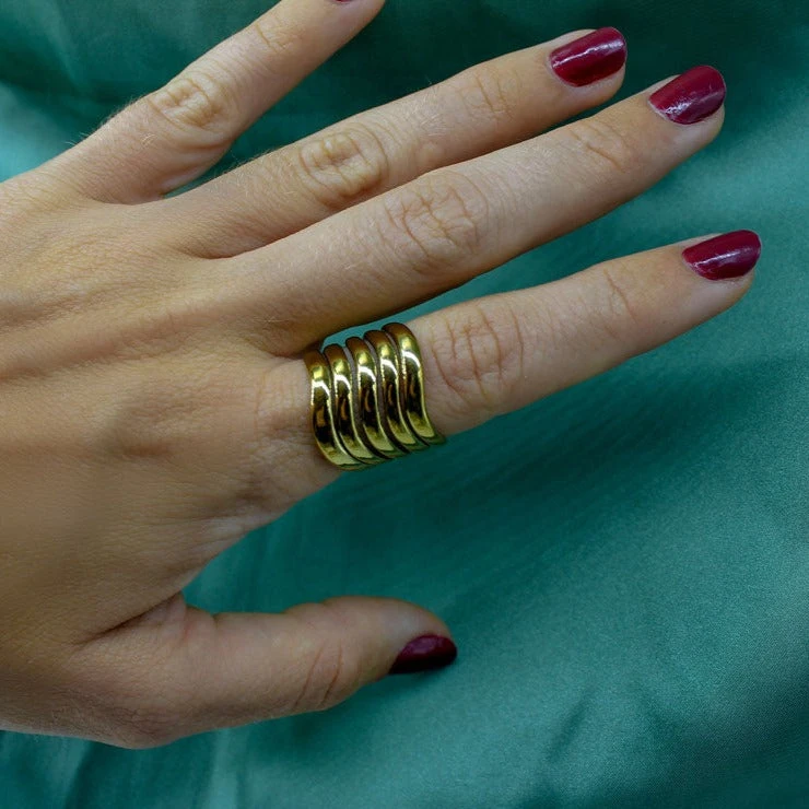 Anillo de acero inoxidable con forma de ondas que se adapta alrededor del dedo. Es ajustable y el dorado es resistente al agua.