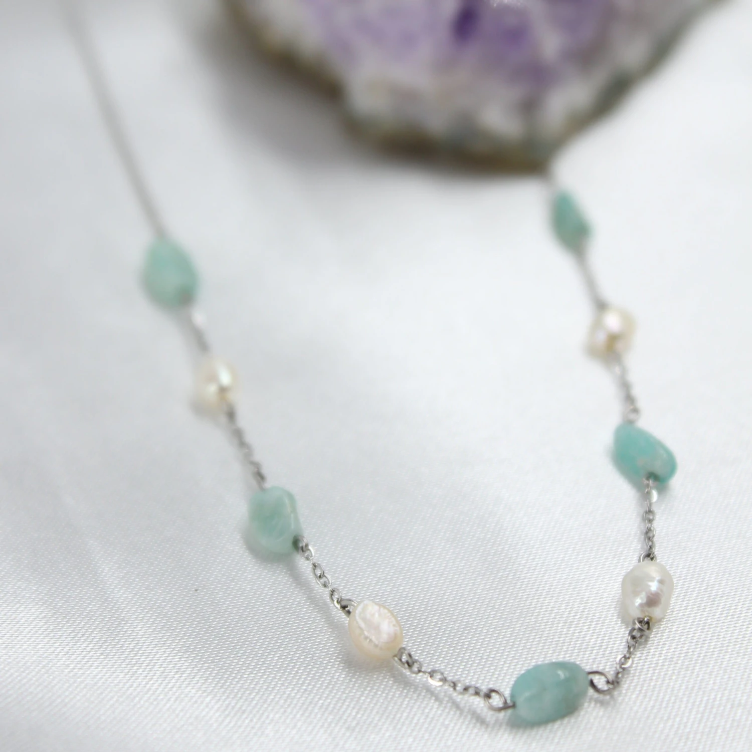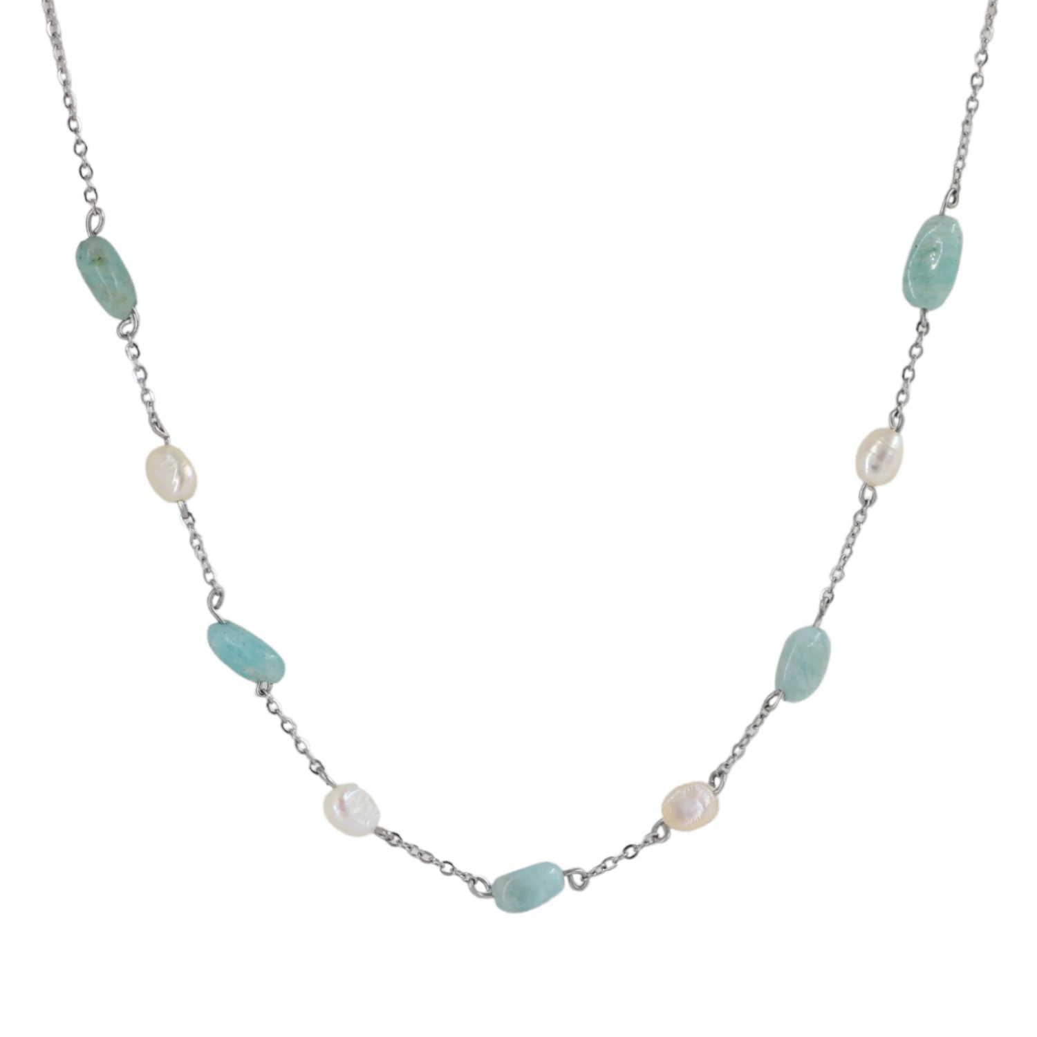 Collar de acero con piedra natural Amazonita con Perlas naturales y cadena de eslabones. Hecho a mano diseño exclusivo