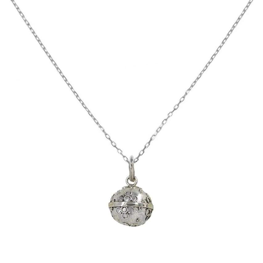 El llamador de Ángeles en este modelo se compone de dos partes, un pequeño cofre de forma esférica con su pequeño cierre y dentro una pequeña bolita estilo cascabel de color dorado