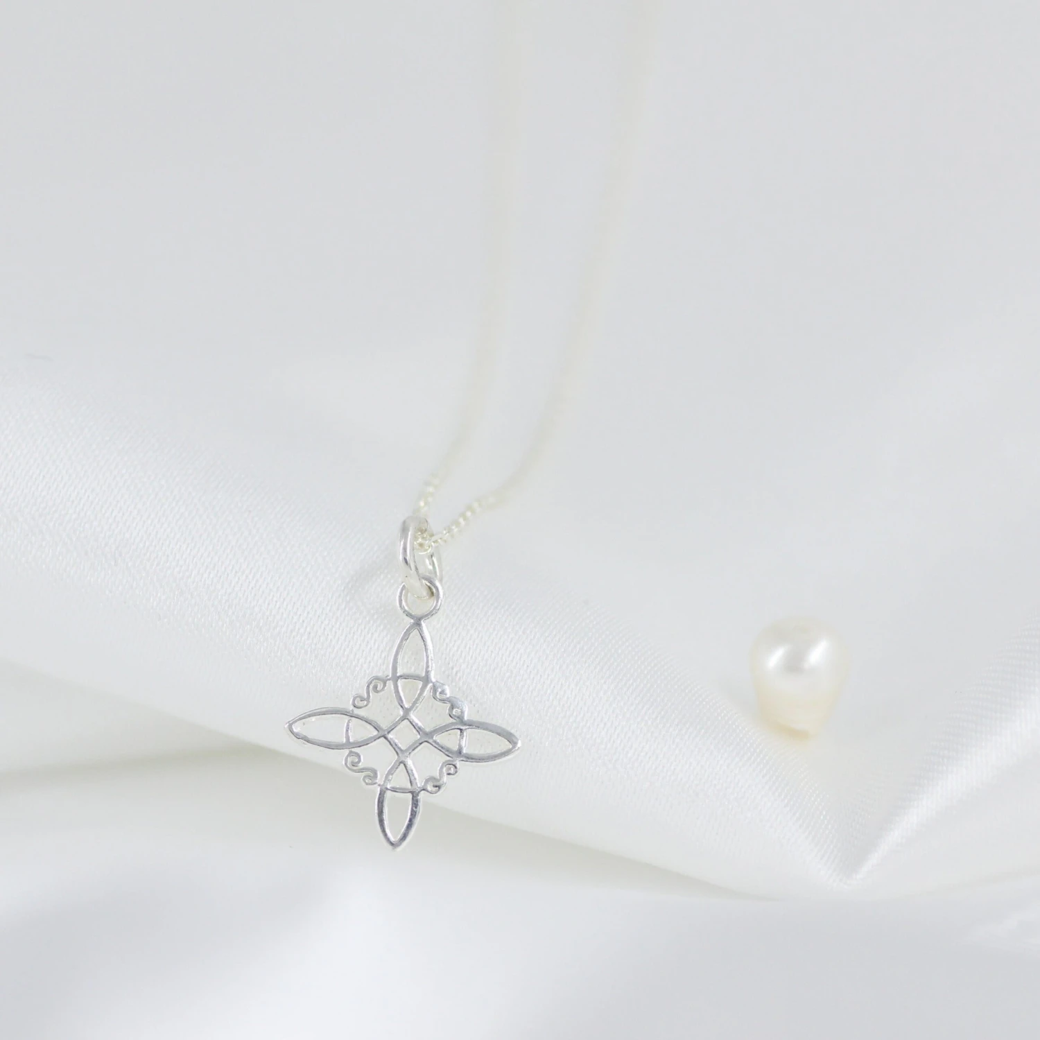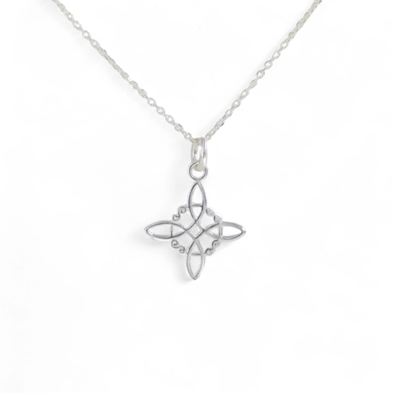 El nudo de bruja plata es un amuleto protector que está formado por dos símbolos entrelazados. El primero de ellos es el círculo, el símbolo universal de la vida, el universo y las cosas eternas, y el nudo de cuatro esquinas. Este último es gaélico y representa las cuatro estaciones, los cuatro elementos, los puntos cardinales y la suerte (trébol de cuatro hojas)