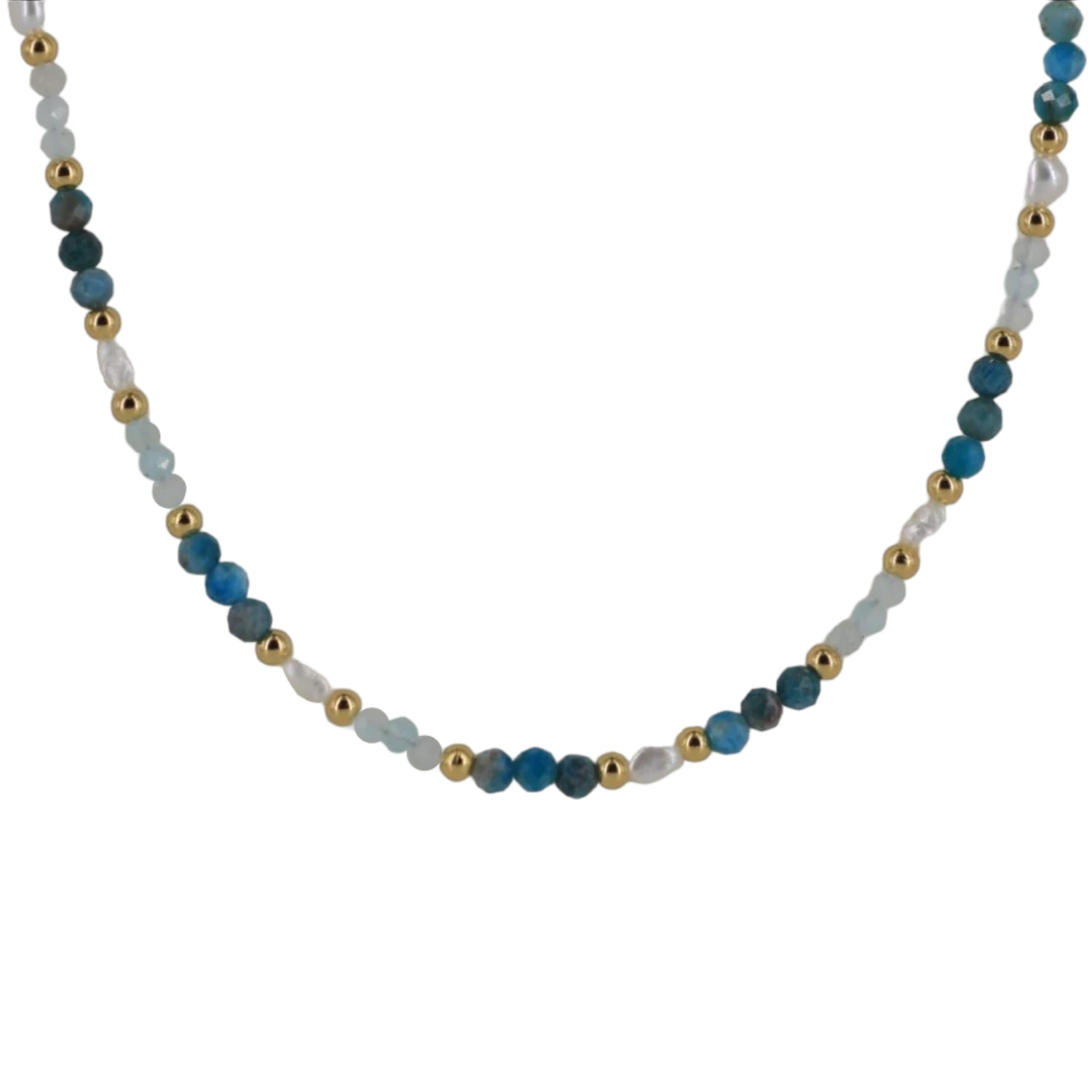 Collar de bolitas hecho a mano con piedras naturales , cristales y bolitas de acero dorado en hilo de acero por lo que es resistente