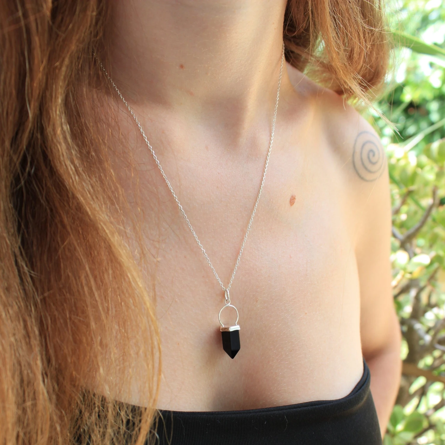 - Collar de Plata 925 con forma de Prisma que sirve como péndulo, engarzado en Ónix