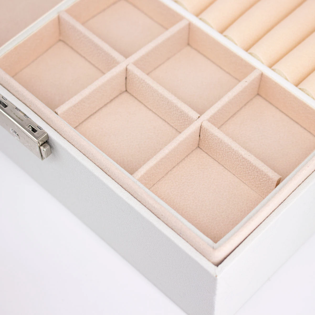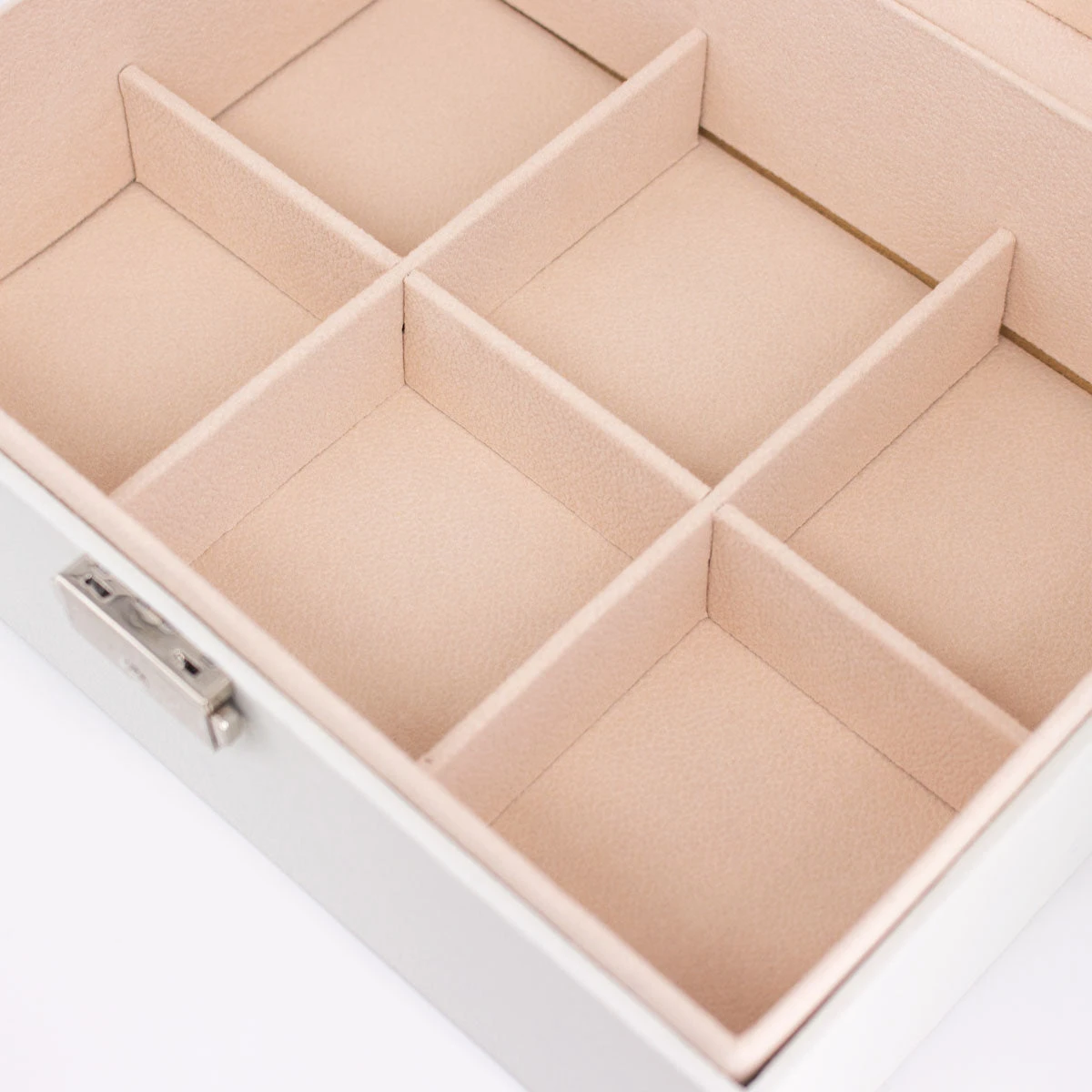 Nuestro Joyero maxi es un joyero con dos pisos que te ayudará a guardar tus Joyas de Alvent en perfecto estado, incluso te lo puedes llevar de viaje. Gracias a que es rígido y es un joyero de piel sintética blanca protegerá tus joyas y piezas de valor contra golpes y humedad.