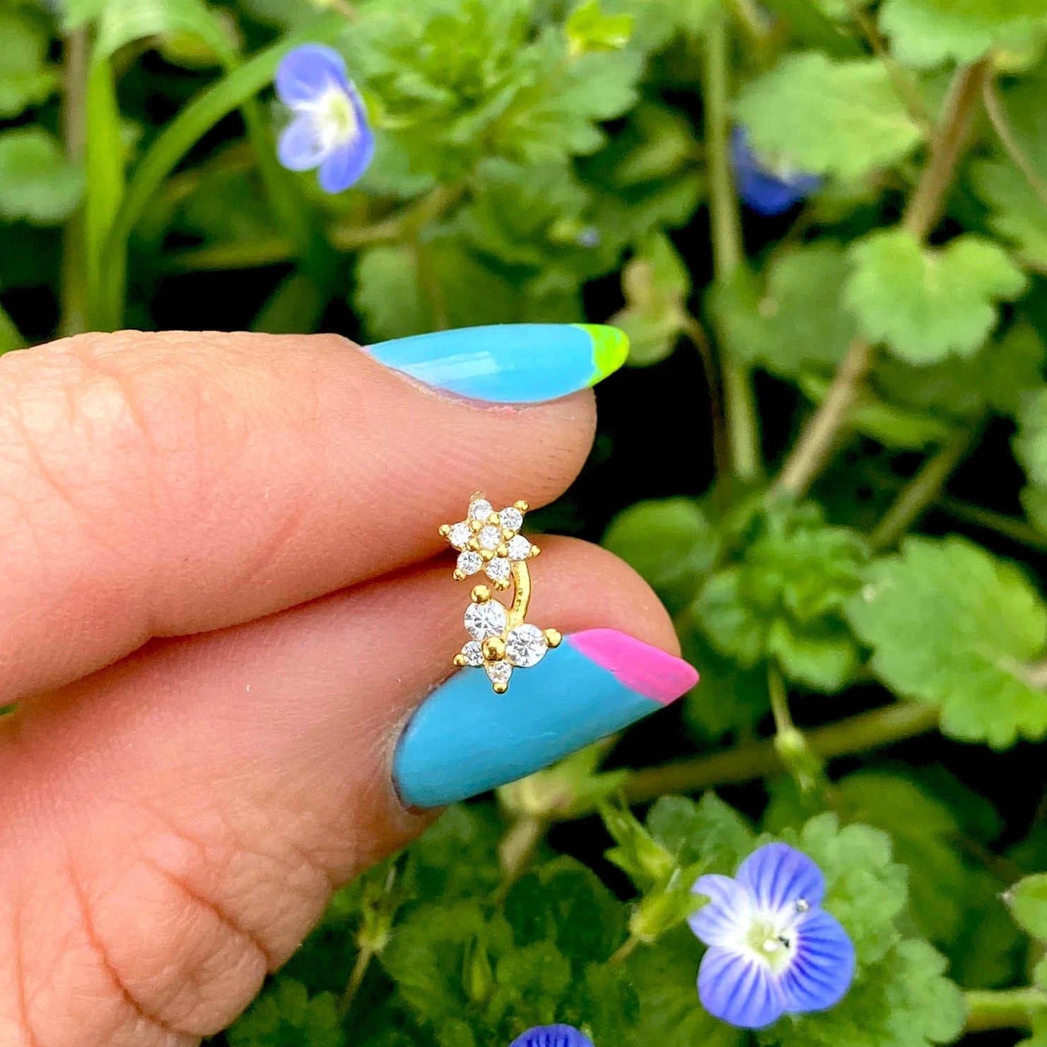 Piercing para la oreja con cierre de rosca de bolita. Su diseño primaveral puede representa a una mariposa entrando a una pequeña flor, o a una flor con sus hojas, ¿Tú qué opinas? Sutil y ligero gracias a su diseño de plata con circonitas engarzadas, dale rienda a suelta a tu imaginación.
