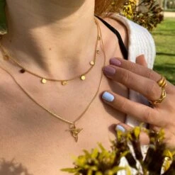 Tobillera con cadena doble, la más fina es una cadena simple con pequeños detalles de bolitas, acompañada de la cadena principal con pequeñas y finas lagrimas que harán que vayas delicada y con estilo.